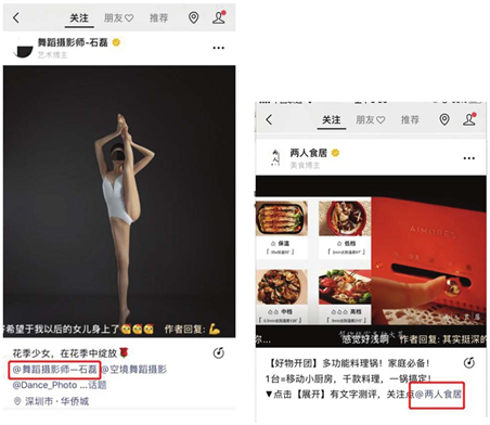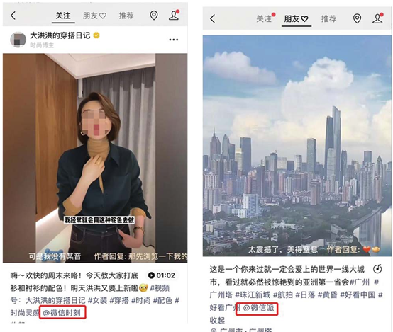 比如视频号“舞蹈摄影师—石磊”在发布视频号时,添加了“@舞蹈摄影师—石磊”;视频号“两人食居”的号主在发布作品时添加了“@两人食居”,如图下图所示;@自己的视频号有两个价值:一是曝光自己的品牌和IP,可以把它当作关键词露出的一种,二是用户在点击时可以直接进入你的视频号主页,优秀的作品+“@自己”功能的组合可以非常有效地激发用户关注,为自己“锁粉”。