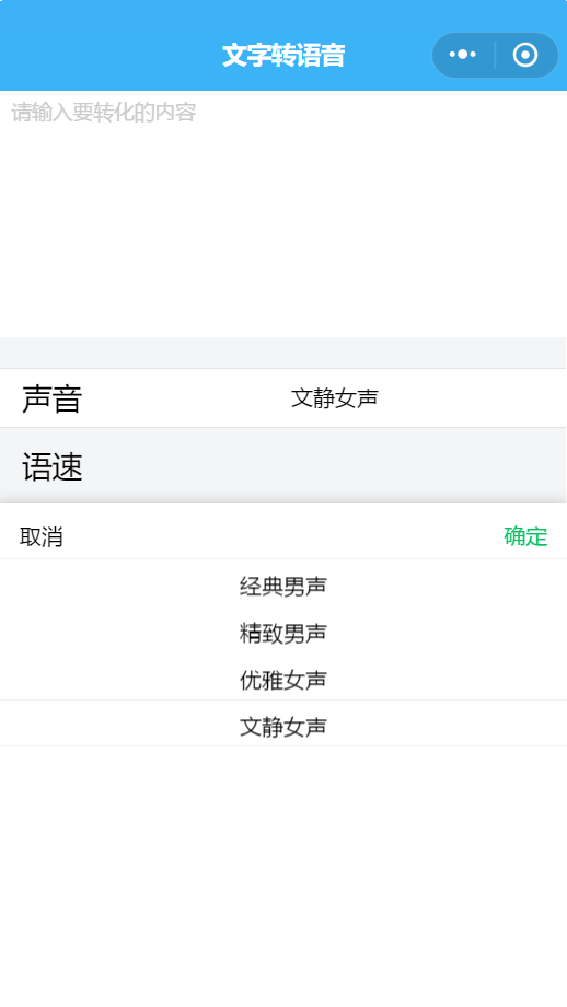 ### 文字一键转成语音完整项目 > demo请于微信小程序搜索:文字一键转成语音 文字一键转成语音是一款采用人工智能技术的文字转化为语音的阅读工具,免费在线一键将文字转换为语音神器。 此完整项目