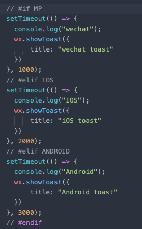 想问一下我想实现在不同平台(微信、安卓、IOS)下实现条件编译,但是按照官方文档的写法,以下三种都会执行,能实现单独执行对应环境的写法么。