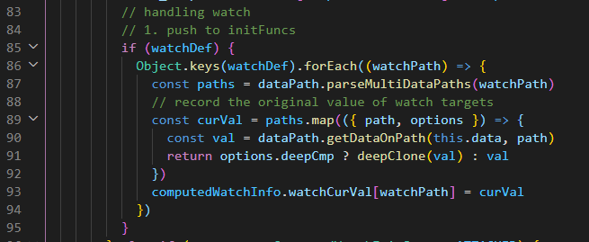 当 observers 对应字段触发时,watch 劫持函数通过对比当前值和旧值(缓存中)是否相等(===)或者严格相等(深度比较)来决定是否触发 watch 对应的函数。触发情况下,会对缓存值更新。