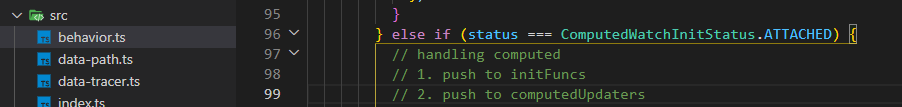 if (computedDef) { observersItems.push({ fields: "**", observer(this: BehaviorExtend) { if (!this._computedWatchInfo) return; const computedWatchInfo = this._computedWatchInfo[computedWatchDefId]; if (!computedWatchInfo) return; let changed: boolean; do { changed = computedWatchInfo.computedUpdaters.some((func) => func.call(this) ); } while (changed); }, }); }官方初始化计算属性时会在 observers 字段内中添加’**’ 字段,在其中循环调用 computedUpdaters 函数,每次会拿出所有缓存中所有计算属性的关联字段,循环对比缓存值和当前实例的新值。来判断是否需要重新初始化对应的计算字段,需要的话, setData对应计算属性新值(不会立即运行,会被收集), 把新的关联和值替换旧的缓存,进入下一次do while循环,直到没有关联的计算属性需要更新后,setData此次do while收集的所有更新的计算字段。这会再一次触发 observers’**’ 整体循环。