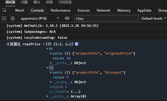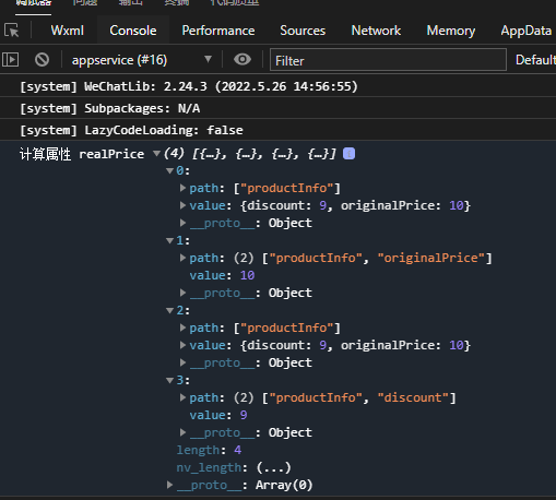 Component({ data: { productInfo: { id: "001", selectedCount: 0, discount: 9, originalPrice: 10, }, }, computed: { realPrice(data) { return ( (data.productInfo.originalPrice * data.productInfo.discount) / 10 ); }, // ... }, // ... });示例 A 中,官方生成的 realPrice 缓存依赖相关路径为: