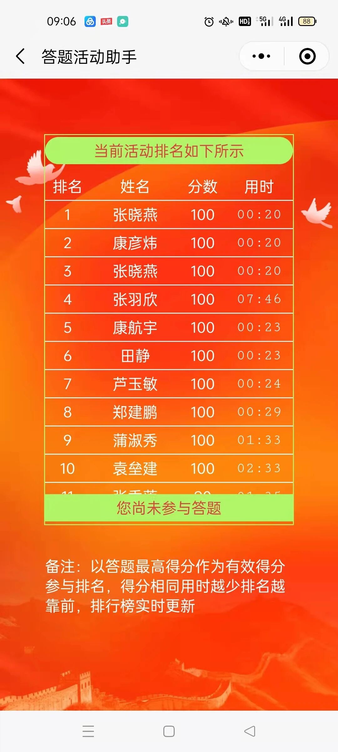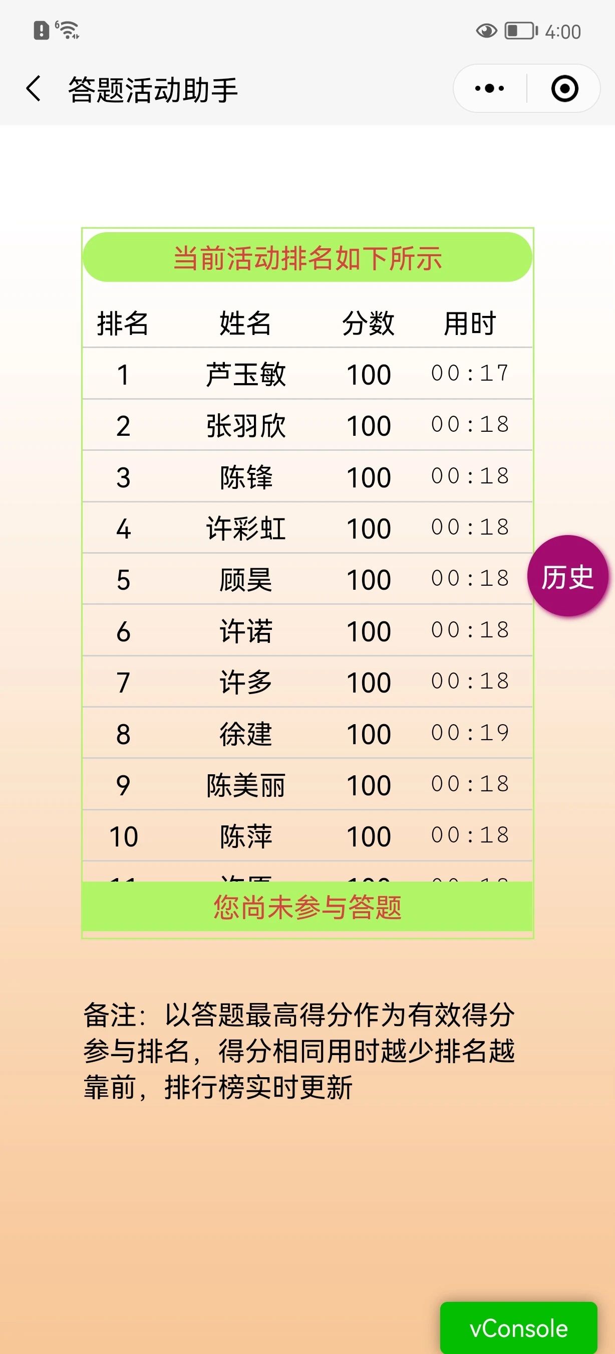 由于本次活动是答10个题,对于100分的用时,如果精确到秒为单位那么很多用户就无法精准计算排名了,针对这二个问题,我做了以下优化
