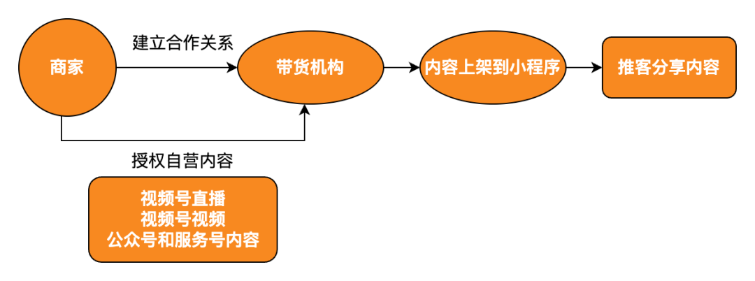 商家授权自营内容(直播间/短视频/公众号或服务号文章)给带货机构,带货机构通过API接口获取商家生产的内容,并上架到带货机构的小程序进行推客带货。