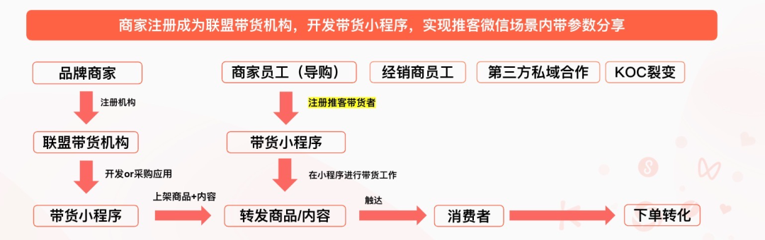 有私域经营需求的商家可以缴纳2万保证金成为带货机构,自行开发或采购推客带货小程序,将自有商品、带货内容上架到自己的小程序内,引导推客进行分享推广。