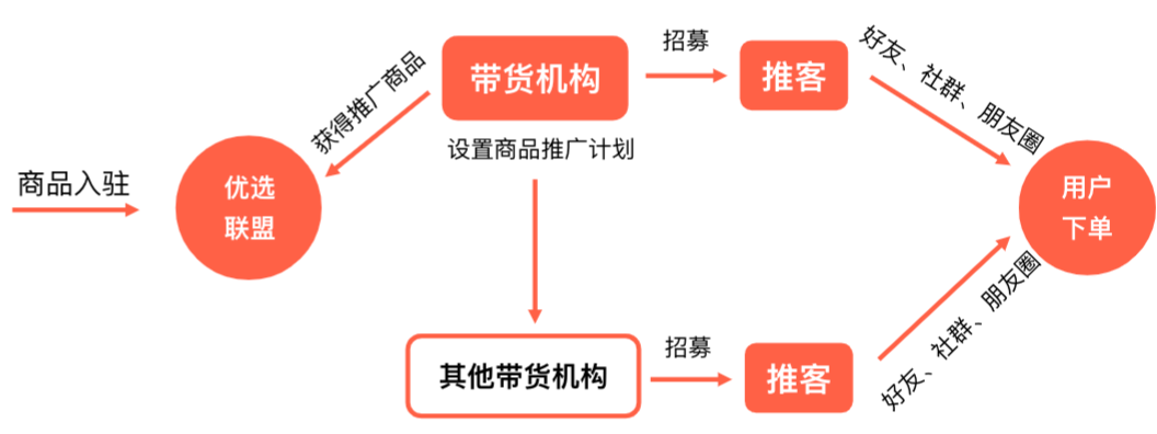商家将商品入驻到优选联盟,并设置「普通推广」或「定向推广」计划,供货给推客带货机构,带货机构通过api接口获取商品并上架到带货机构的小程序进行推客带货。