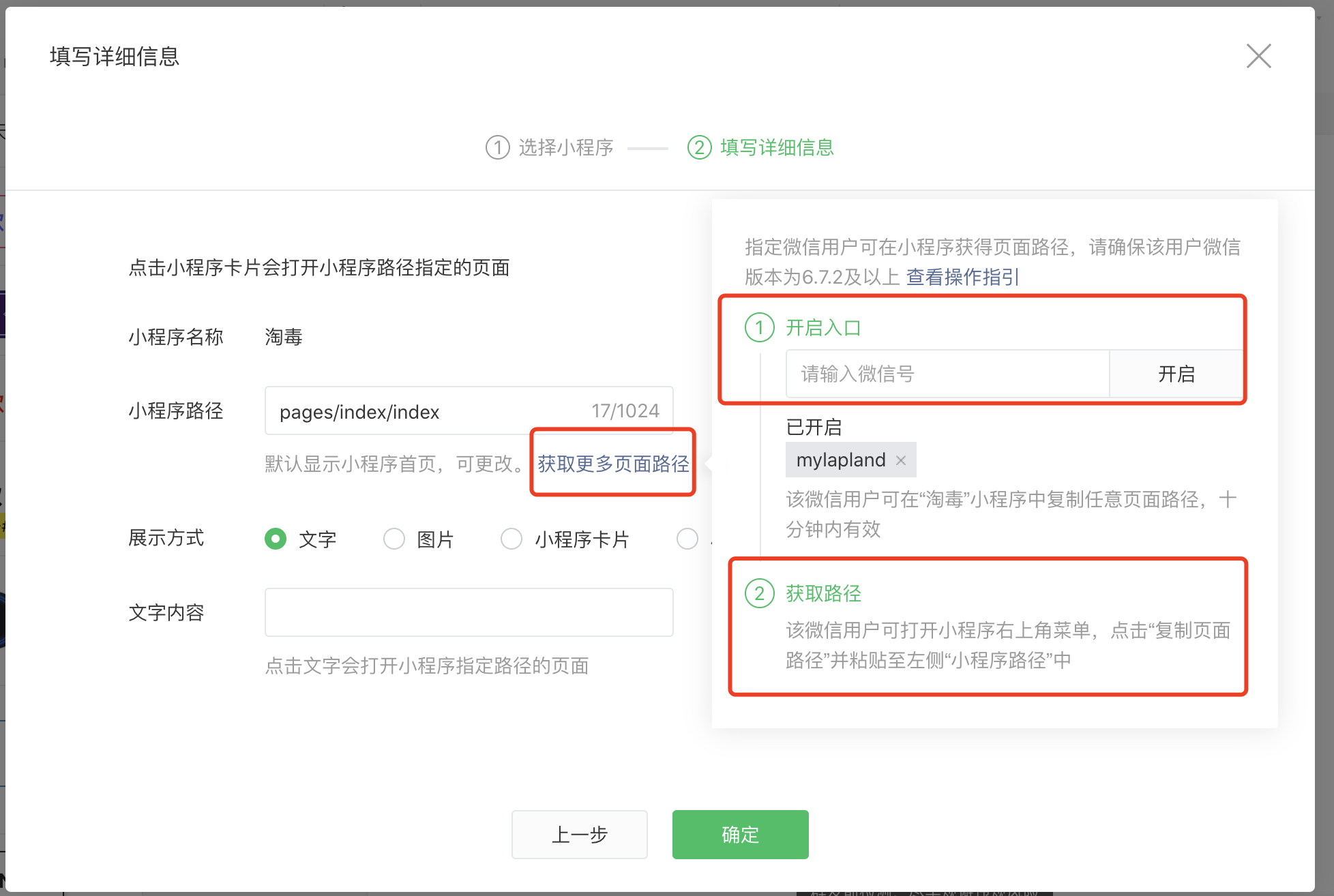 3,在小程序页面选择需要关联的微信小商店,点击之后选择获取更多页面路径,然后在右侧1的地方填入你的微信号,在点击开启。这样子的话这个微信对应的小商店就 指定用户可以查看小程序页面路径的权限。