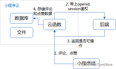 用户进行评论点赞的时候,会在小程序端发起请求调用云函数并带上 openid,云函数用 openid 查询原有的后台服务看看该用户是否有权限进行操作,如果用户具有权限,则把评论和点赞的数据都写入云开发的数据库中。