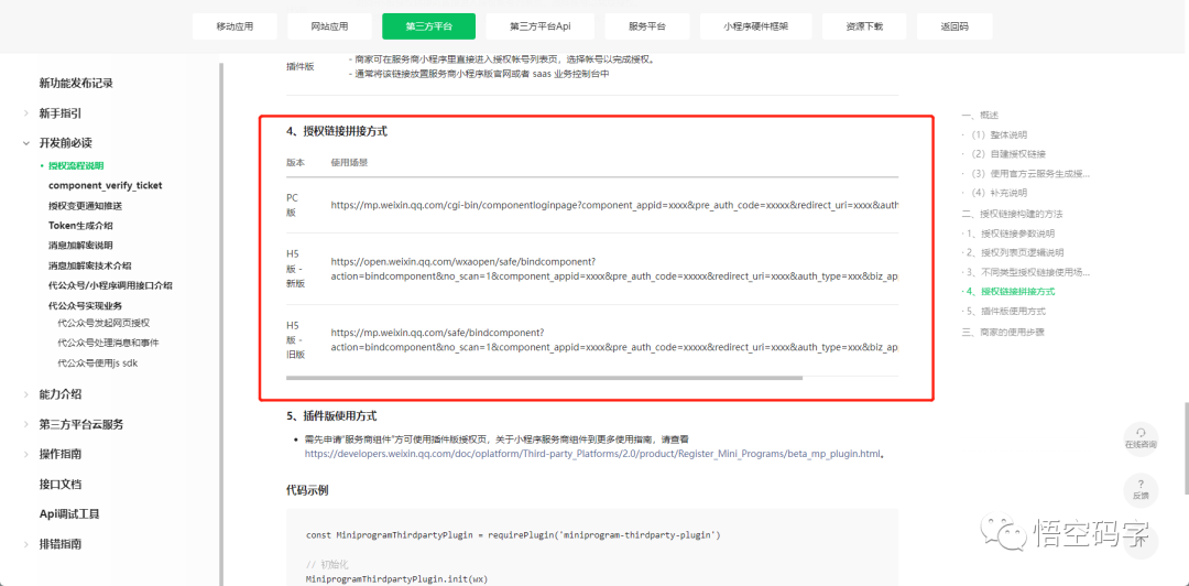 【拼接授权链接】:我们拿到pre_auth_code之后,这一步不需要调用接口,而是拼接授权链接。准备“授权回调 URI”,公众号/小程序管理员扫码或者访问移动端授权链接,确认同意授权给第三方平台。管理员授权确认之后,授权页会自动跳转进入回调 URI,并在 URL 参数中返回授权码和过期时间