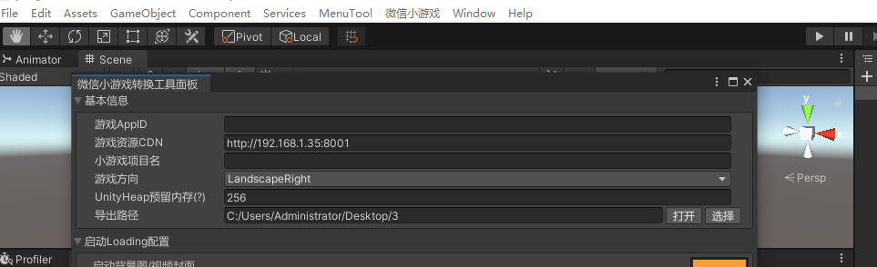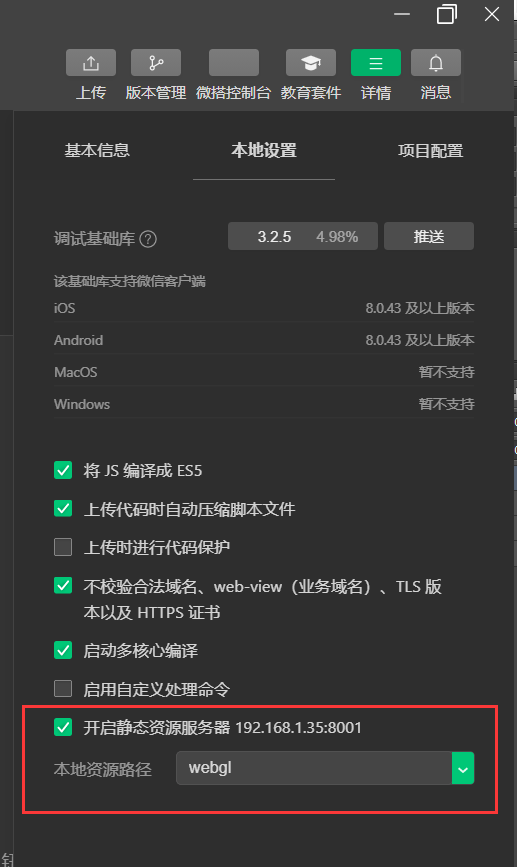 1.设置本地的资源地址 在unity转微信小游戏的面板上填 http://192.168.1.35:8001 这个是微信开发者工具提供的本地静态资源的地址,每个人的不一样,具体查看 微信开发者工具里面的静态资源地址。