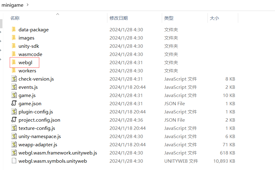 2.移动导出文件位置,导出的文件有minigame和webgl文件,minigame是上传到微信的,webgl是传到CDN上的资源,这里因为是使用本地测试,所以需要将webgl放入到minigame文件夹里,方便在微信开发者工具里读取资源,因为微信开发者工具只读项目内的文件。