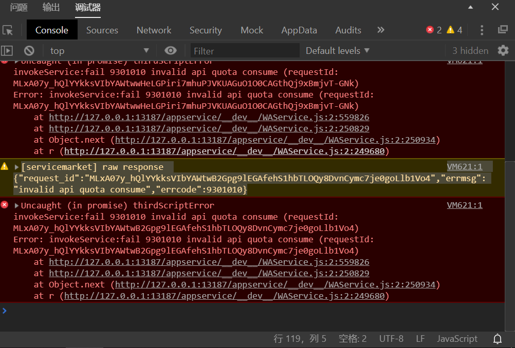 VM621:1 [servicemarket] raw response {"request_id":"MLxA07y_hQlYYkksVIbYAWtwB2Gpg9lEGAfehS1hbTLOQy8DvnCymc7je0goLlb1Vo4","errmsg":"invalid api quota consume","errcode":9301010}