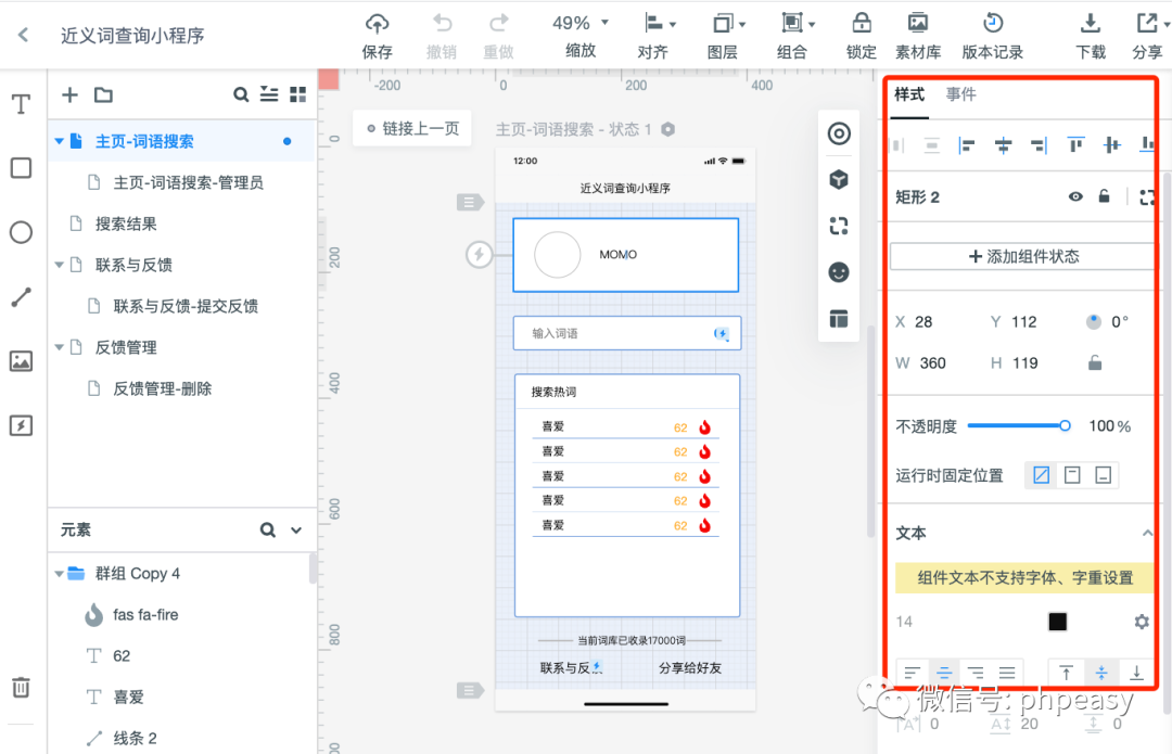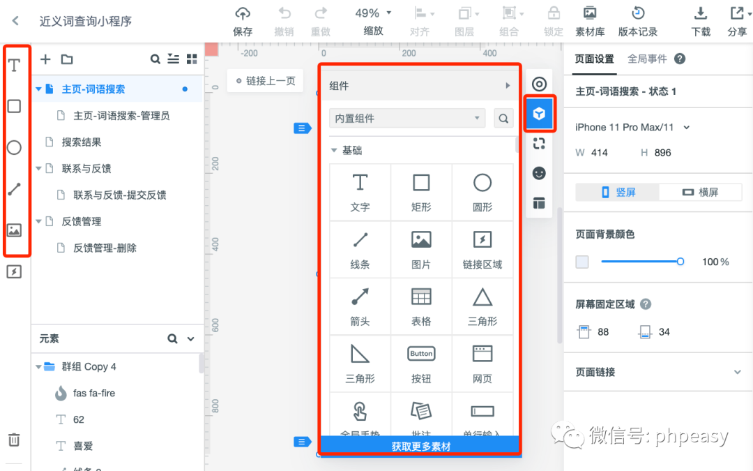 原型的开发,我们可以分为5步,第一步,建立页面,第二步,使用组件进行布局(页面结构),第三步,为组件设置样式(变得更好看些),第四步,给各个按钮之间添加跳转链接,第五步,将做好的原型进行预览和发布。