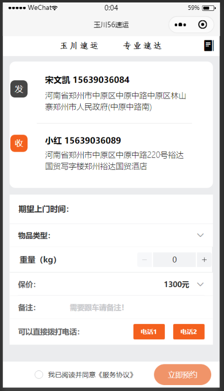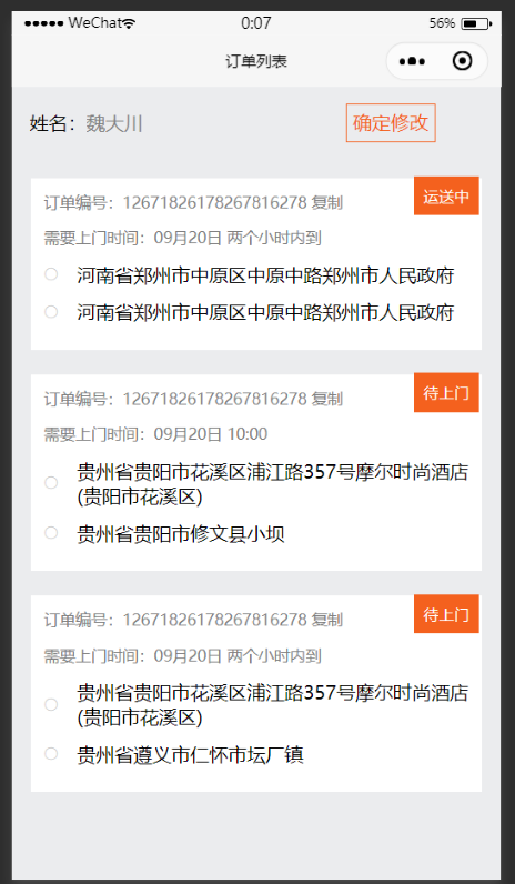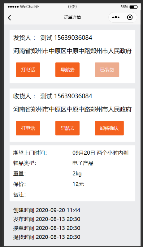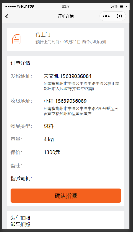 物流小程序,方便用户填写物流信息,用于物流公司。方便物流公司推广,用户可以利用公众号里的小程序下单,管理员就可以看到订单信息,管理员给用户打电话确认,确认之后指派司机