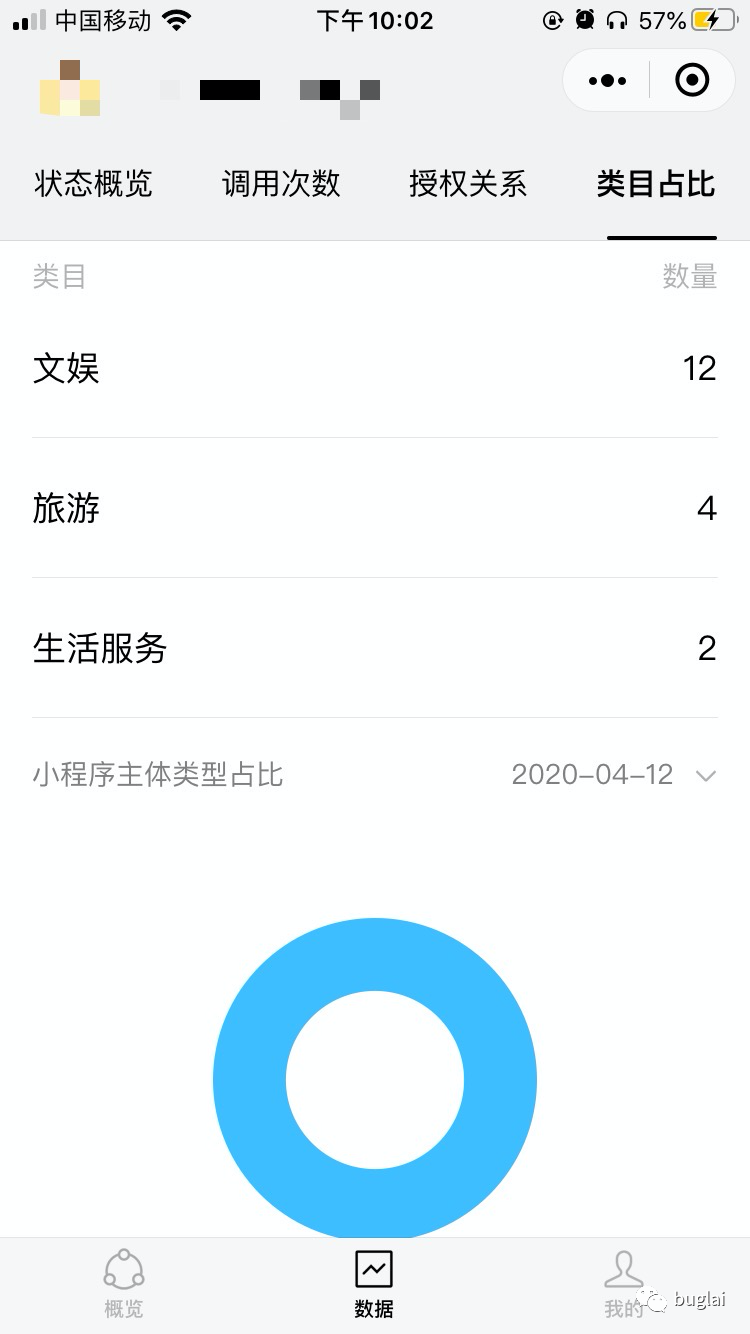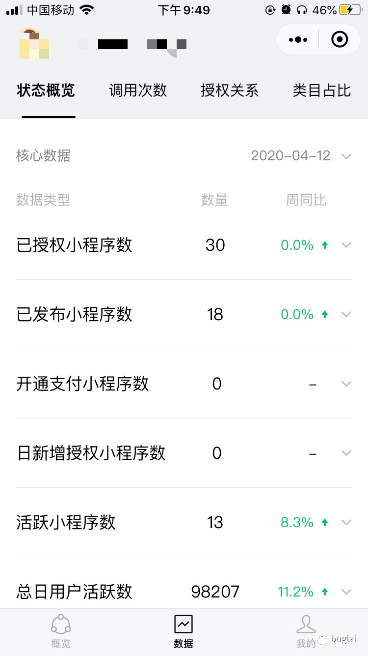 数据页可以看到自己的开发平台账号相关的具情况,比如状态概览,可以看到已经授权给账号的小程序数,已发布的小程序数以及活跃小程序数和总用户活跃数等。