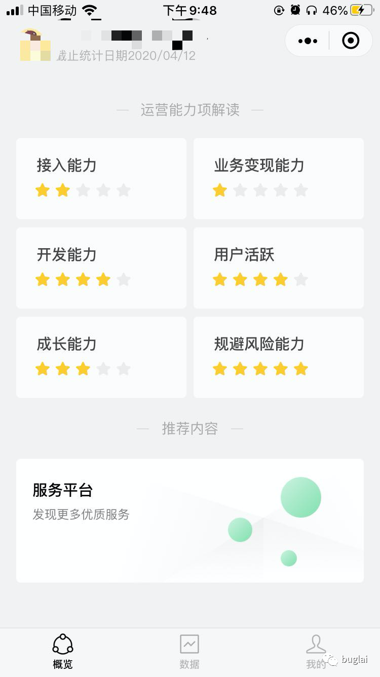 首页你可以看到自己的开发平台账号在微信生态里面的各项运营能力星级指数(接入能力,业务变现能力,开发能力,用户活跃,成长能力以及规避风险能力),各项星级指数越好,自己每个月的加急审核次数越多。