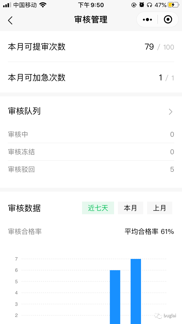 我的页面可以看到审核管理,进入可以看到自己的开放平台账号本月还可以提审多少次(默认可以提审100次),以及本月可以加急的次数(前面有提到各项指数越高,每个月加急的次数越多)。我们可以选择账号下的产品进行撤销审核,加急审核等。ps:当然作为服务商,微信有提供这些审核以及通知的相关接口,我们完全可以做成自动化,批量化提审(假如你小程序够多,嫌麻烦的话)。