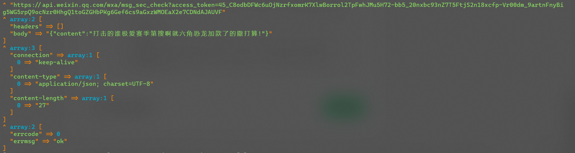 $content = '特3456书yuuo莞6543李zxcz蒜7782法fgnv级'; $uri = sprintf('https://api.weixin.qq.com/wxa/msg_sec_check?access_token=%s',$access_token); $options = [ "headers" => [ "Content-Type" => "application/json", ], 'body' => json_encode(['content'=>$content],JSON_UNESCAPED_UNICODE), ]; dump($uri); dump($options); $resp = di(ClientFactory::class)->create()->post($uri, $options); $resp2array = json_decode($resp->getBody()->getContents(), true); dump($resp2array);脑瓜疼! 有谁用guzzle 的成功示例吗?贴下!谢谢!