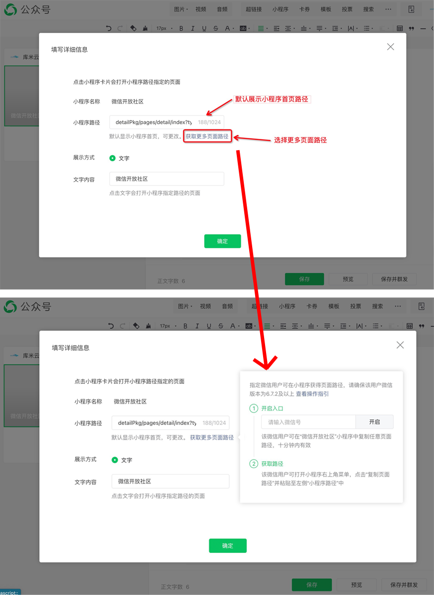 - 打开小程序的复制路径的权限,在第一步中我们输入小程序AppID,搜索出微信开放社区小程序,然后点击下一步,进入填写详细信息弹窗中,默认小程序路径为小程序首页路径,这里我们选择【获取更多页面路径】,然后右侧弹出窗口,将你的微信号输入进去即可开启复制页面路径的入口。