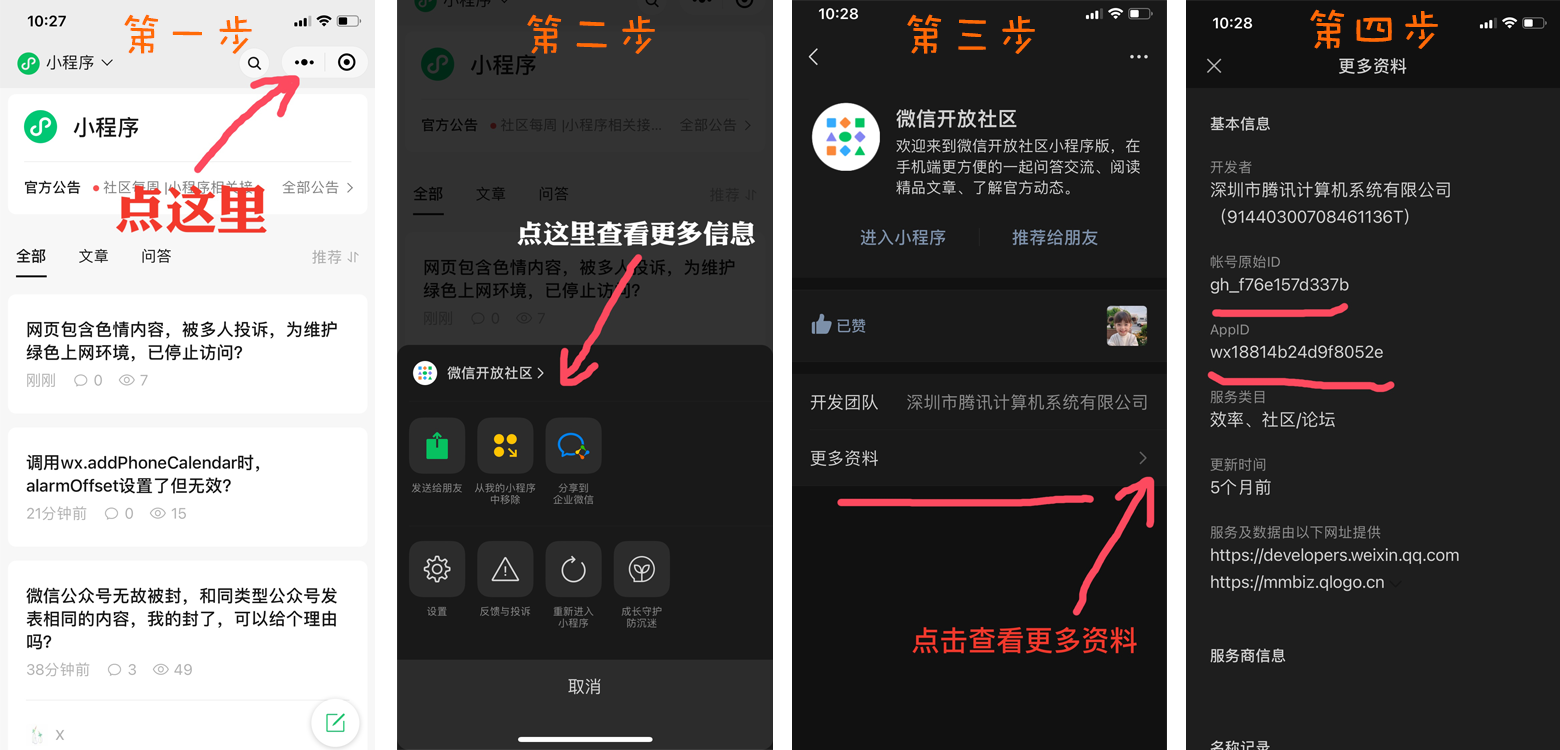 找到你想要跳转的小程序,点击右上角三个点,然后弹出小程序信息的弹窗,进入小程序的页面,点击更多资料,即可以看到小程序的AppID和原始ID。然后复制AppID或原始ID到步骤一去搜索。下面我用微信开放社区小程序举个例子,告诉大家如何找到微信小程序的AppID。