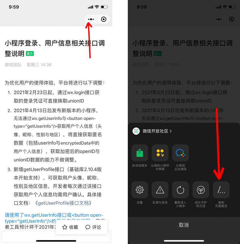 - 去小程序中获取制定页面路径:打开微信开放社区小程序,进入到你想要复制页面路径的页面,点击右上角三个点,弹出弹窗,在第二排又一个按钮【复制页面路径】,点击即可复制。
