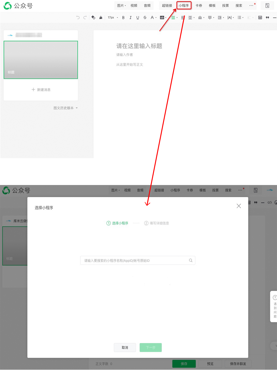 登陆微信公众号平台,打开编写图文消息的页面,点击小程序,弹出选择小程序弹窗,这里需要我们根据小程序名称/AppID/帐号原始ID去搜索。
