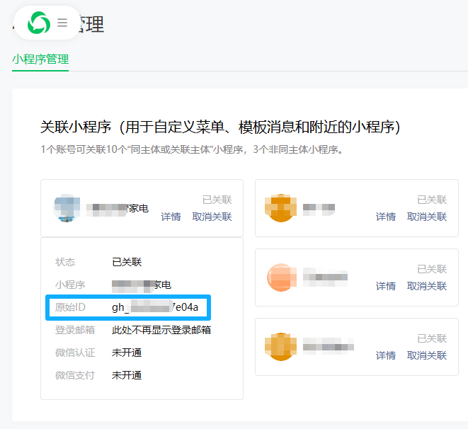 有一个获取原始ID的小技巧,只要知道该小程序的名称或者APPID,就可以通过任意公众号/服务号的小程序管理功能,通过关联小程序后,就能查到该小程序的原始ID了。