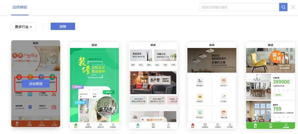 进入平台的小程序模板挑选页面,里面的小程序模板涵盖了很多的行业,每个行业的需求、风格都有一定的针对性,每个模板都是精心策划的,尽可能满足不同的需求。而且小程序模板都已进行了行业分类,只要点击左上角的“更多行业”按钮,在弹跳出的页面中进行行业挑选或是文字输入的搜索。