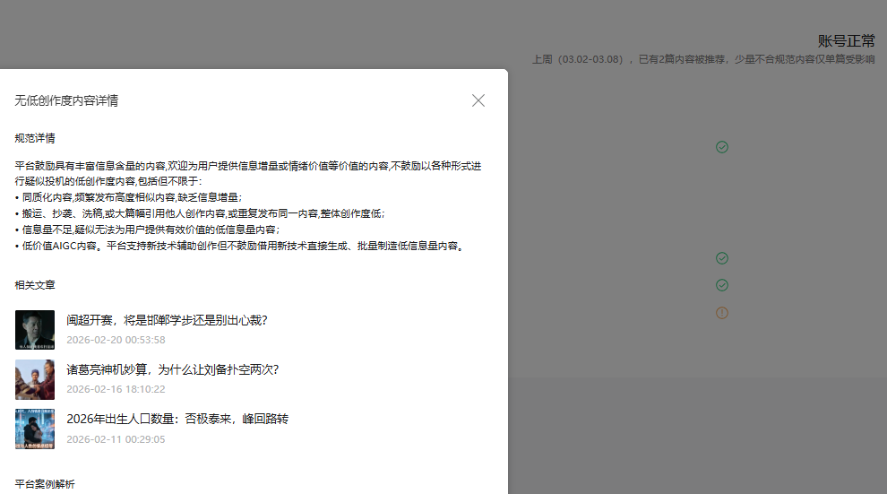 内容质量没有降低,被误判以后流量推荐直接清0,之前每月都很多10万+,现在基本维持2万,断崖下跌😮💨