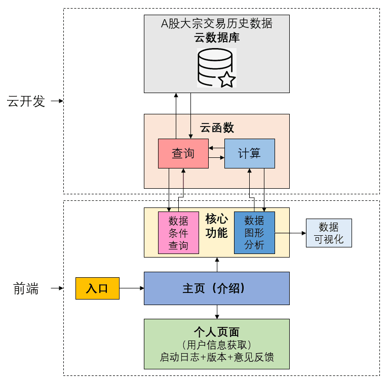 (2)依托云函数,实现基于云端计算的大宗交易数据分析。接受用户前端请求,通过云函数,调取云数据库中大宗交易数据,根据指令相关的计算模型,开展关键数据计算并返回结果。