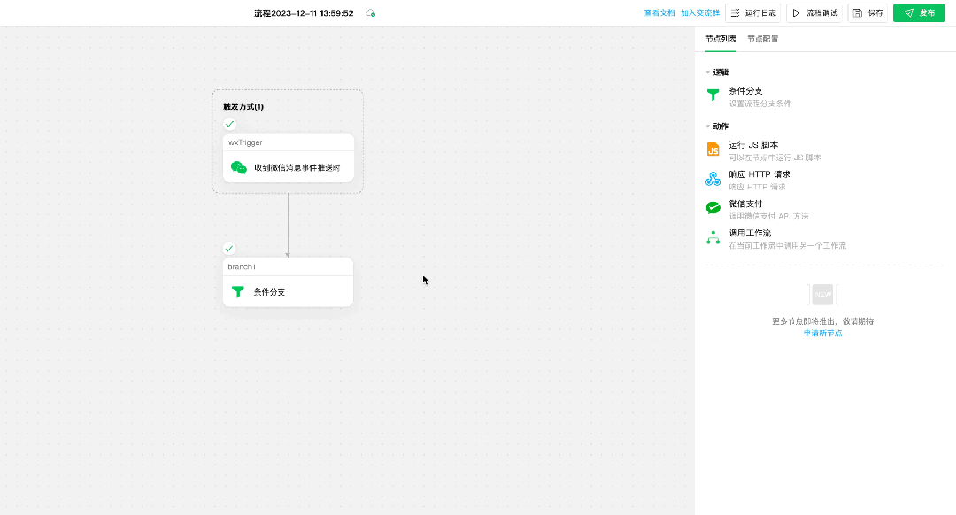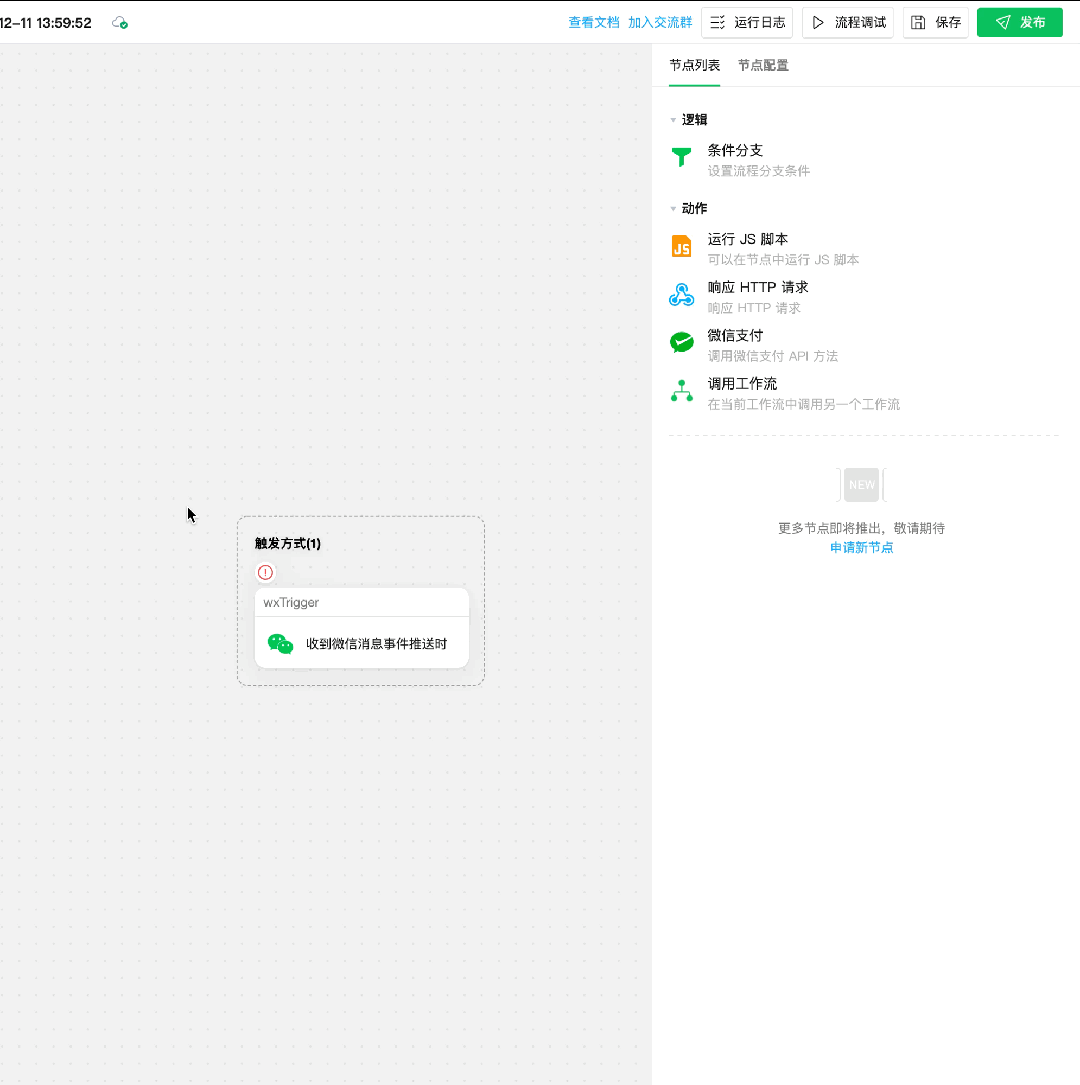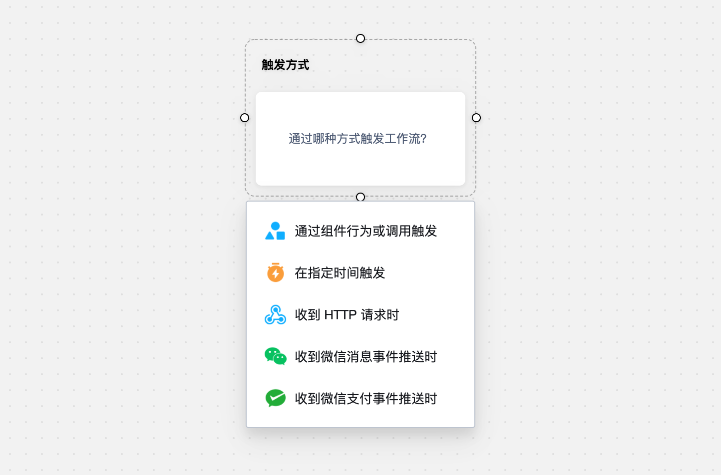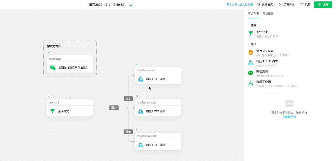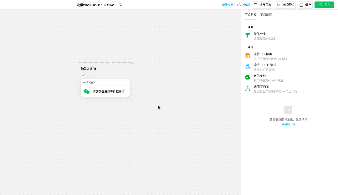 除了由微信消息触发之外,工作流还提供了很多触发节点,比如HTTP调用,组件访问,微信支付事件等。