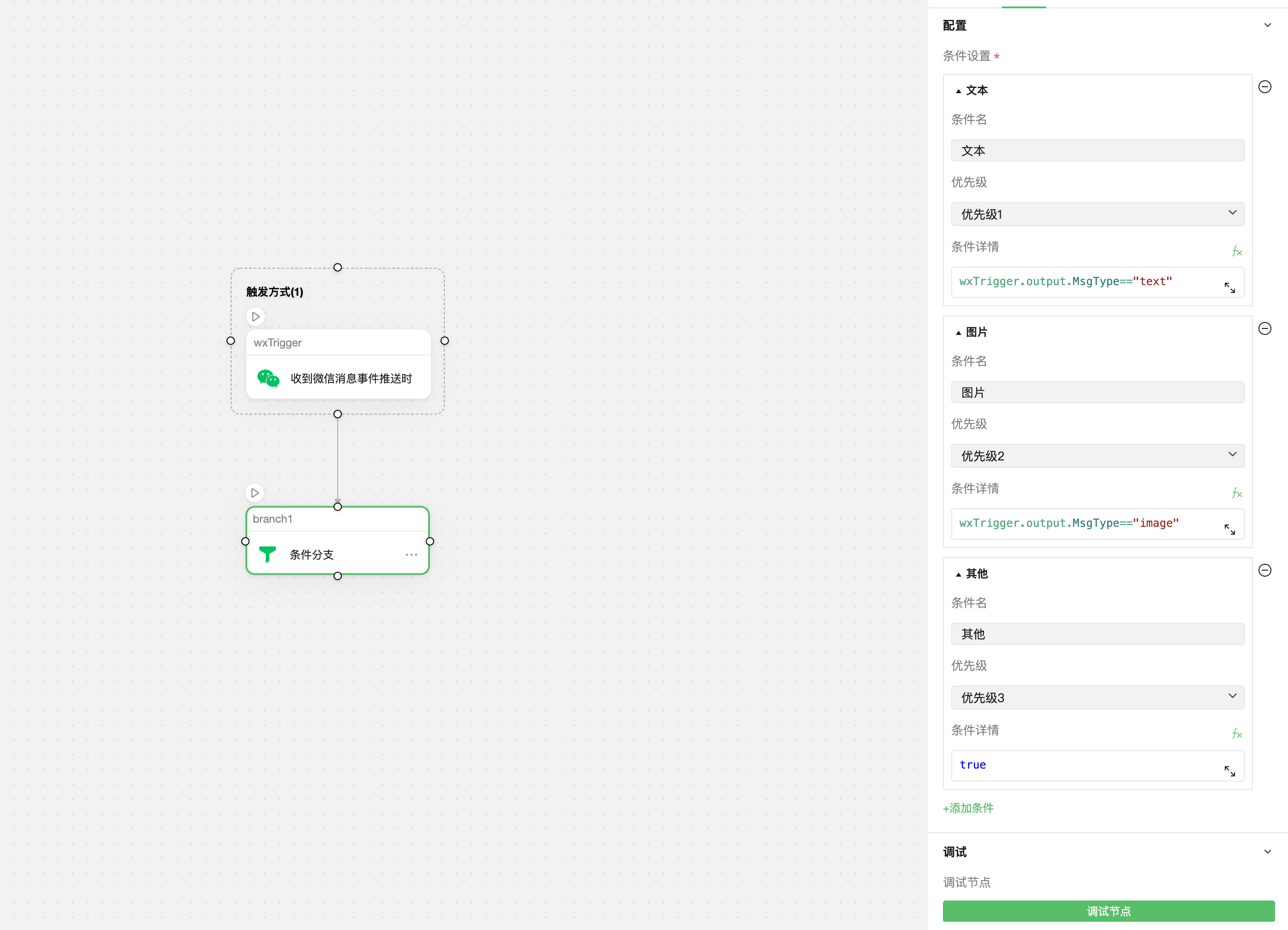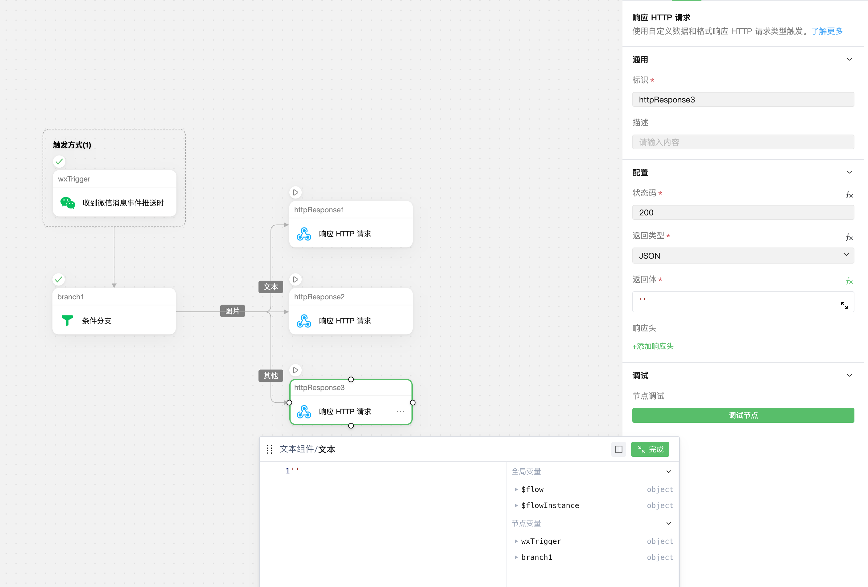 我们可以看到我们的判断逻辑生效了,工作流会根据我们发送的消息类型完成扭转。