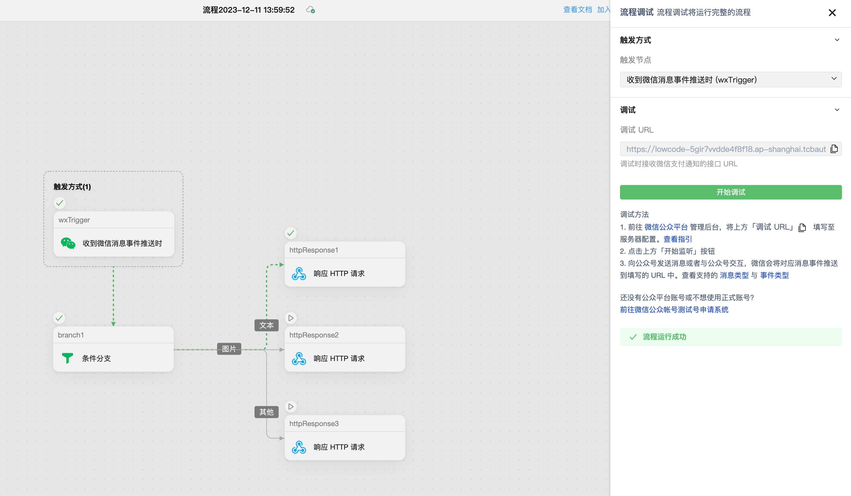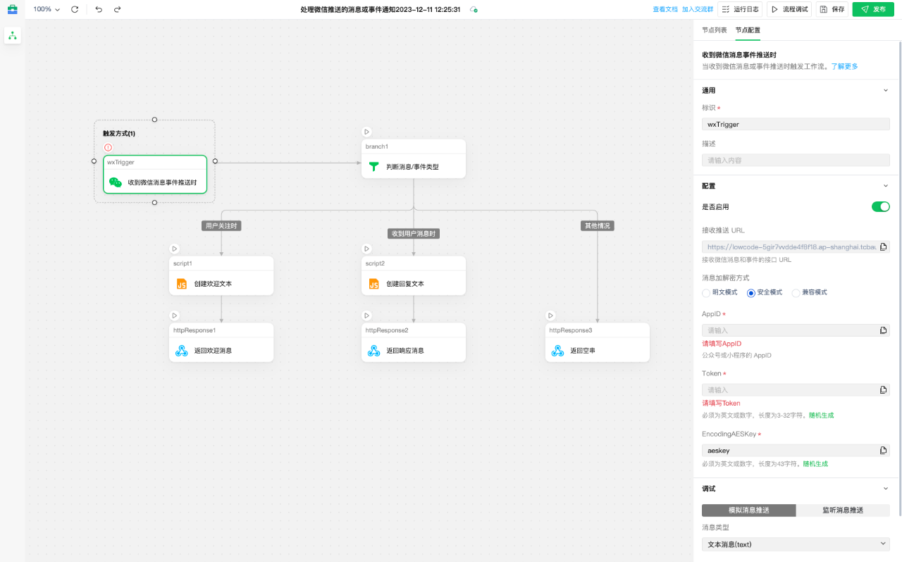 5. 设置完毕后,我们就开始整体流程调试,点击右上角「流程调试」,前面我们配置小程序后台之后,我们就可以在调试时主动发送小程序客服消息来实现触发。如下演示:
