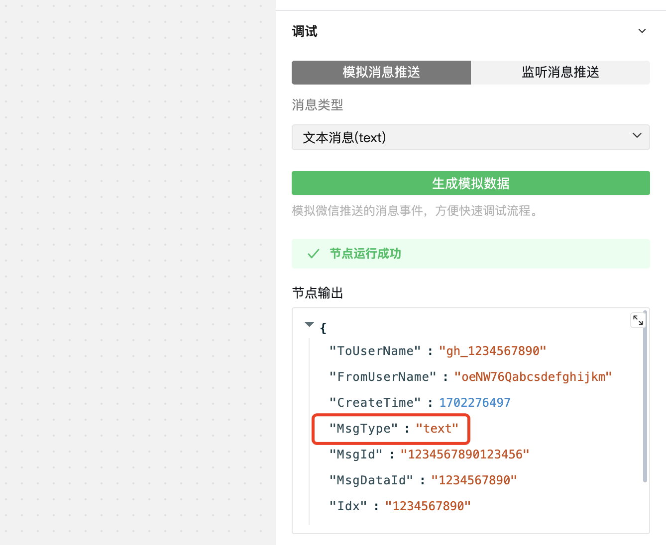 我们可以通过模拟数据或者真实监听来看到触发时接收的消息结构,以便于后面我们做相关判断处理。如下图我们知道接收文本消息时,MsgType 为 text。