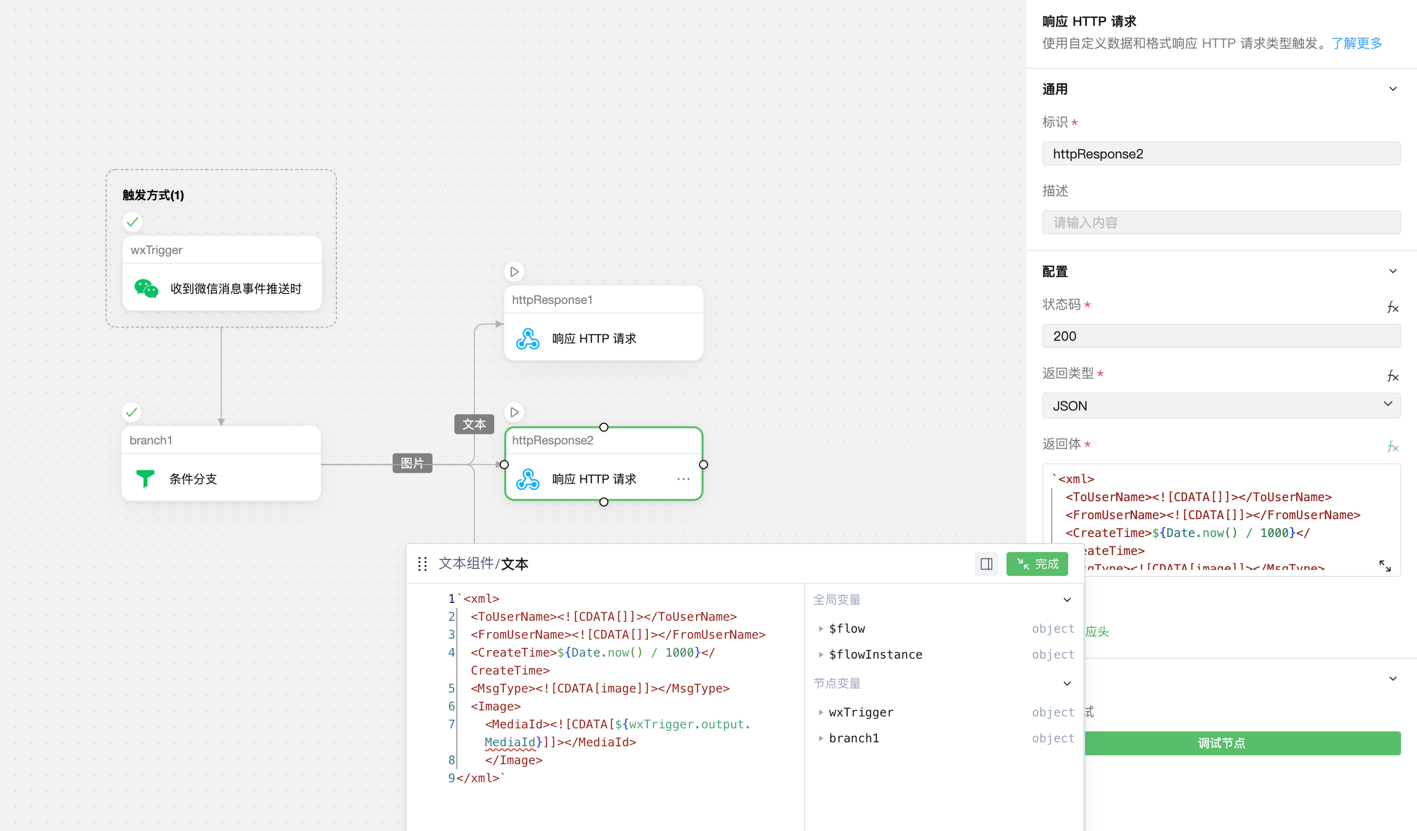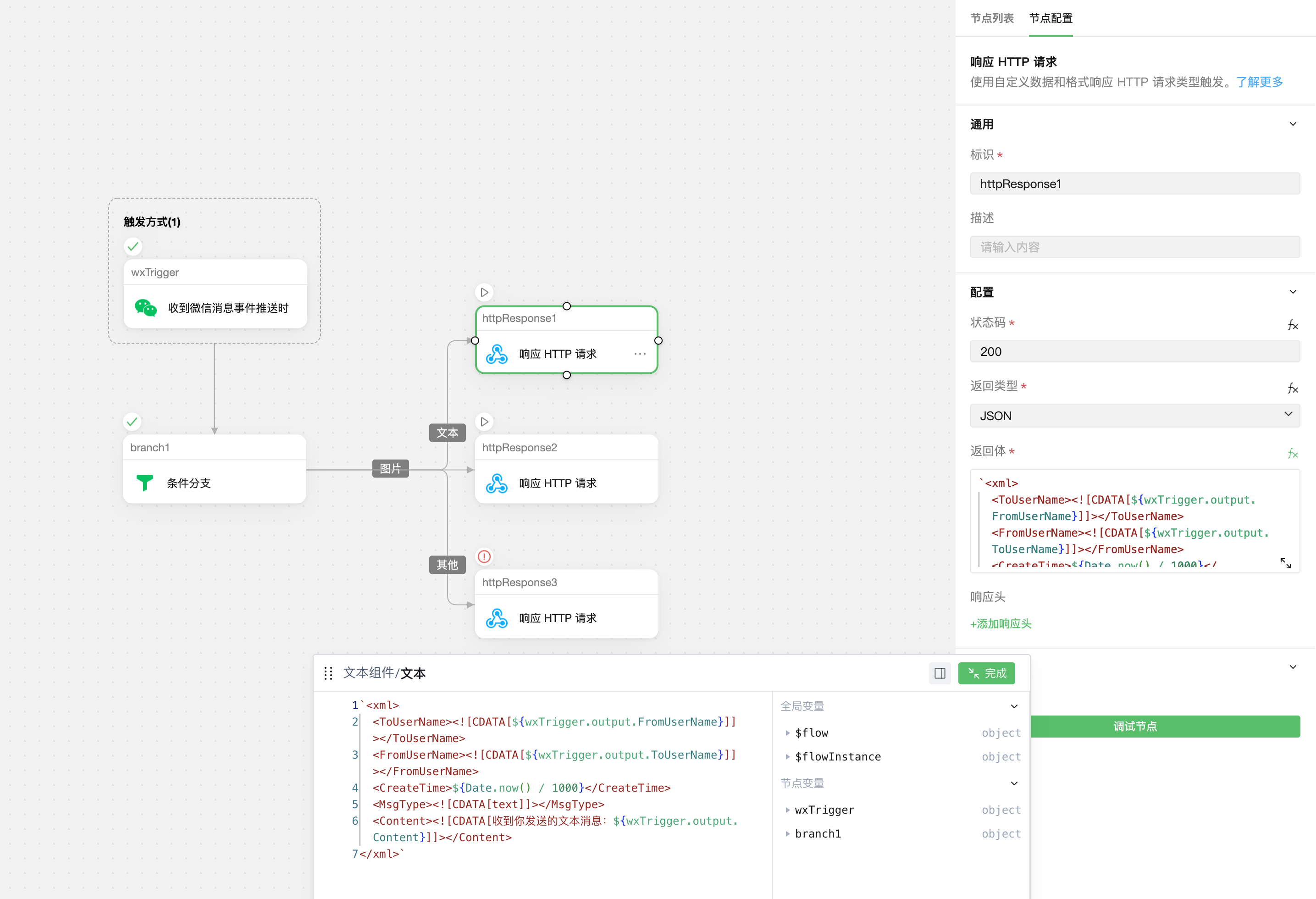 4. 有了条件分支我们就可以相对应的做处理了,在这里为了简化演示,我们直接用被动回复来做(主要注意被动回复只在公众号生效,小程序需要调用接口回消息)。返回的格式我们还是要遵循微信文档描述的响应模式。