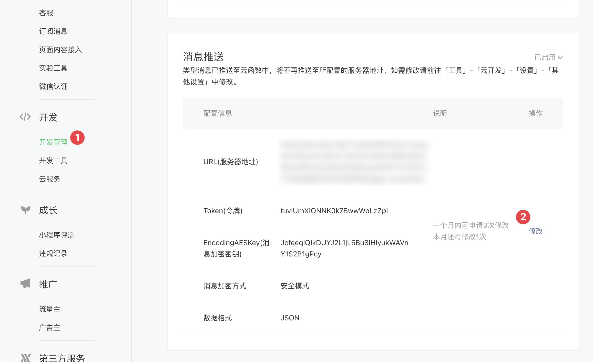 当你需要真实的调试时,需要在小程序后台配置相关的信息,下图appid、token、EncodingAESKey和url需要对应的填入公众号或者小程序后台。