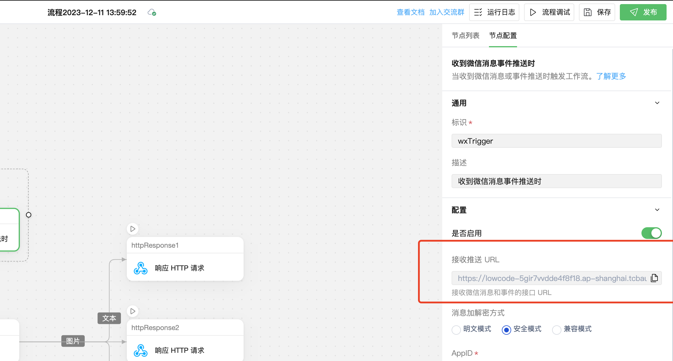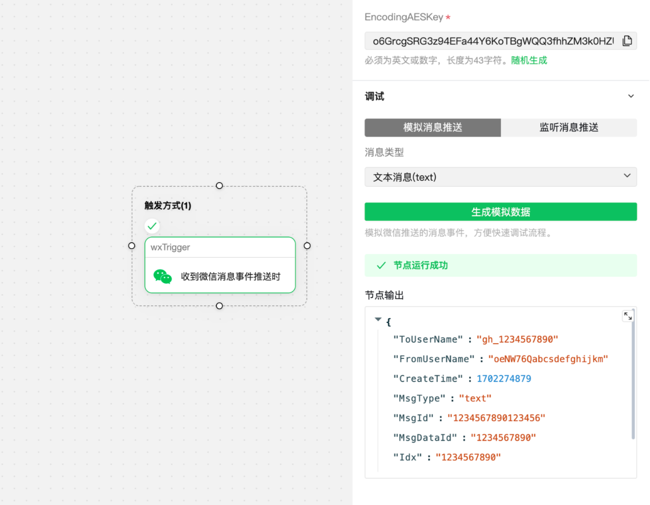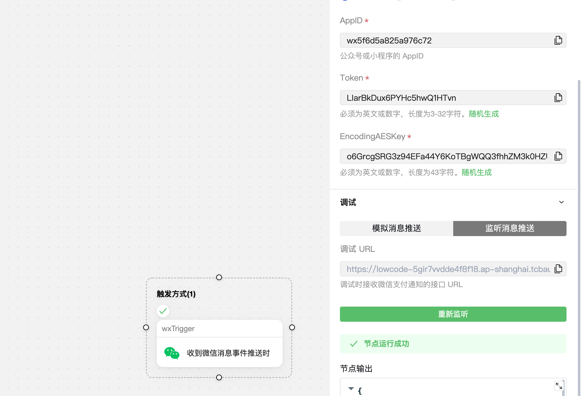 2. 对触发器节点配置一些基本信息,我们点击触发节点,在右侧抽屉栏中对应的填写appid,以及token还有解密AESkey