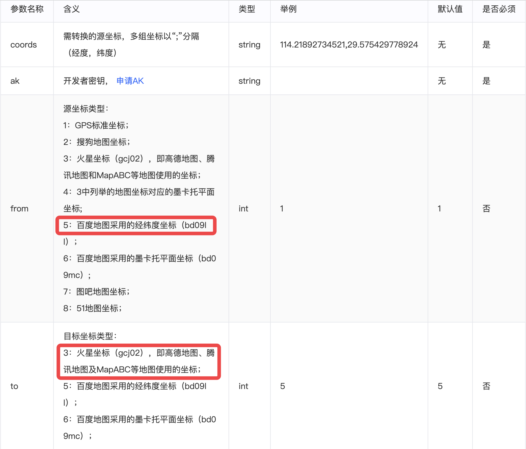 2. from: 来源坐标系 (0表示WGS-84坐标,2表示GCJ-02坐标)