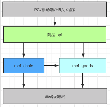 之所以画成实线,一方面是因为对于前端来说 api 层是很真实的存在,前端同学不关心接口底层是由 mei-goods 还是 mei-chain 实现,只对接 api;另一方面,我们可以在 api 层做一些聚合类的操作,比如对于商详页,我们除了基础的商品信息,还需要聚合一些活动信息,比如这个商品是不是参与了秒杀、拼团、体验价,还需要聚合库存等等,如果没有单独拎出来,那我们就很容易把这些逻辑也放到 mei-goods 或者 mei-chain 来实现,这样就又造成了污染。