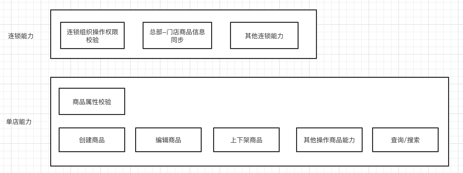 商品的单店能力由 mei-goods 实现,连锁能力交给 mei-chain 负责。当然如果单店和连锁能力都需要再往细拆分,也可以拆分成更细的服务。
