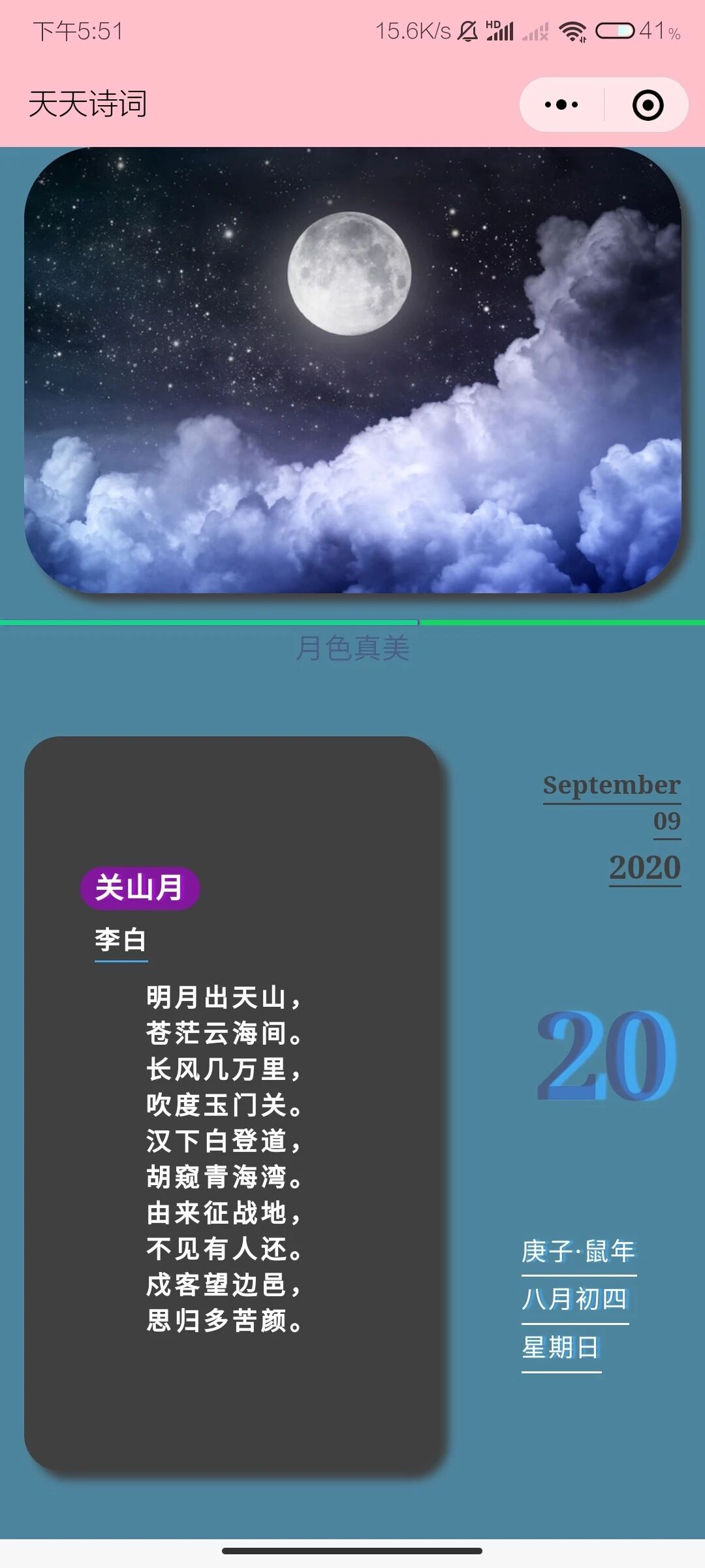 目标用户:用于查询今天是几号,不像往常的日历只有枯燥的数字,用于赏心悦目的欣赏日历,由于技术不成熟很多地方没实现所以介绍就这样子简简单单的,拿个参与奖就好了