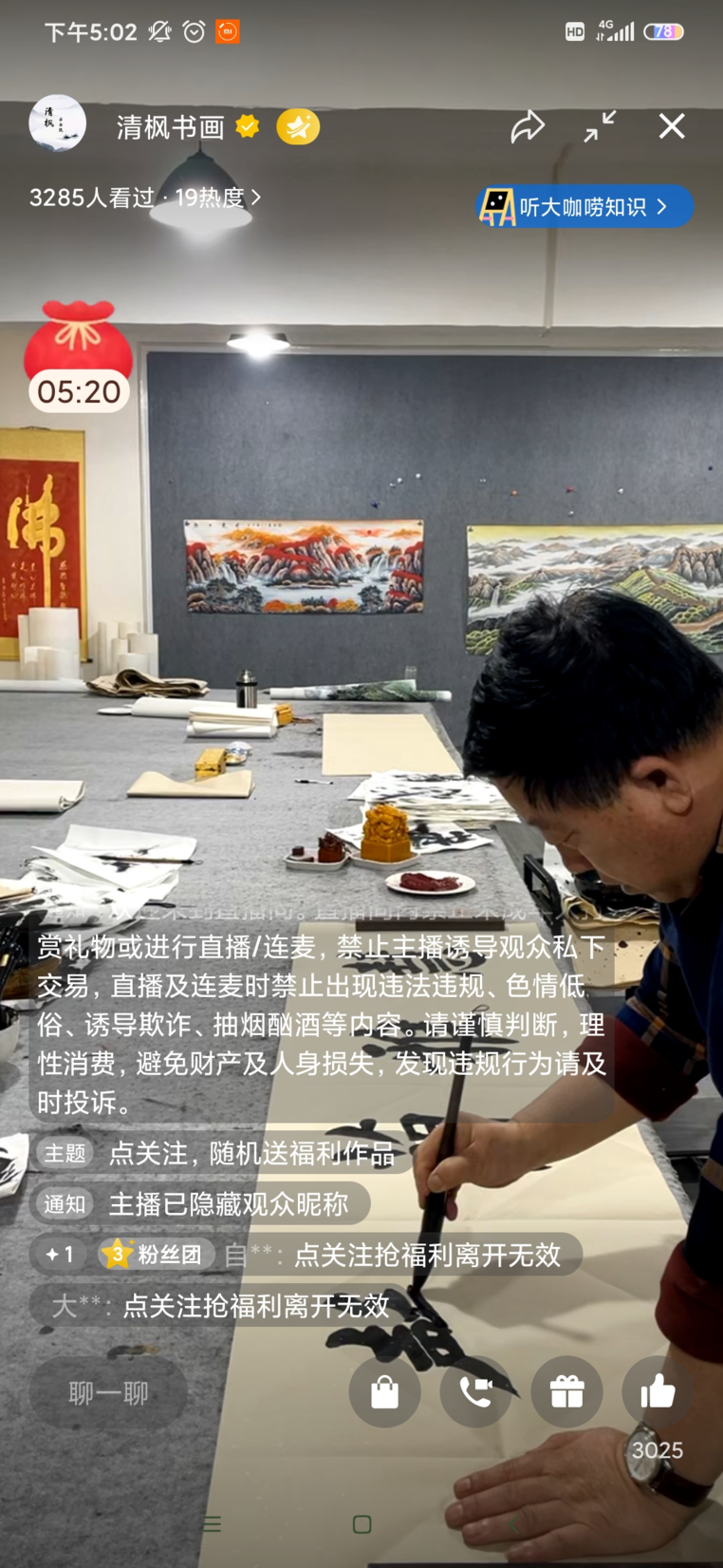 直播带货让书画作品得以在公共领域传播,跨越地域限制与用户“面对面交流”,也让书画家们得到更多的认可,增加人气的同时,也可以挖掘有购买意愿的潜在用户,增加收益。