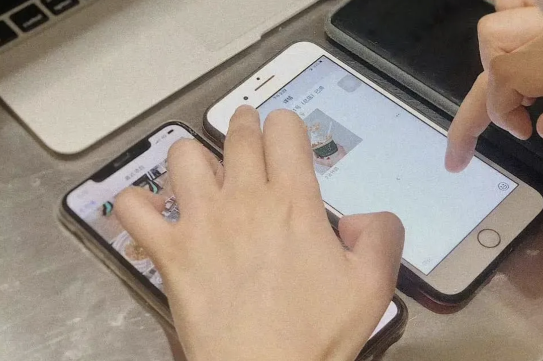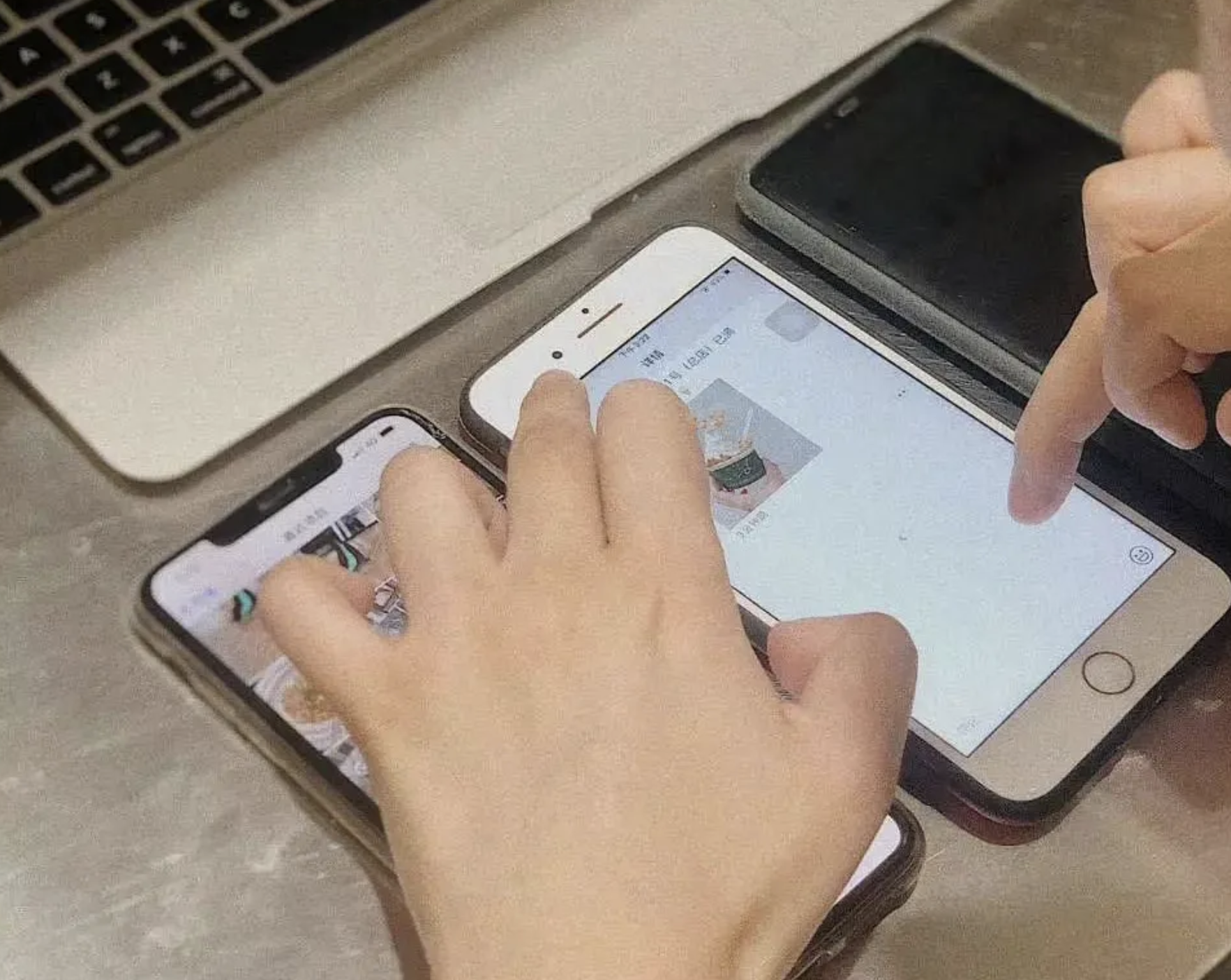 在装修时尚的门店,每人手里拿着一杯奶茶拍照,图片导入修图软件,精修完后分享到了朋友圈,