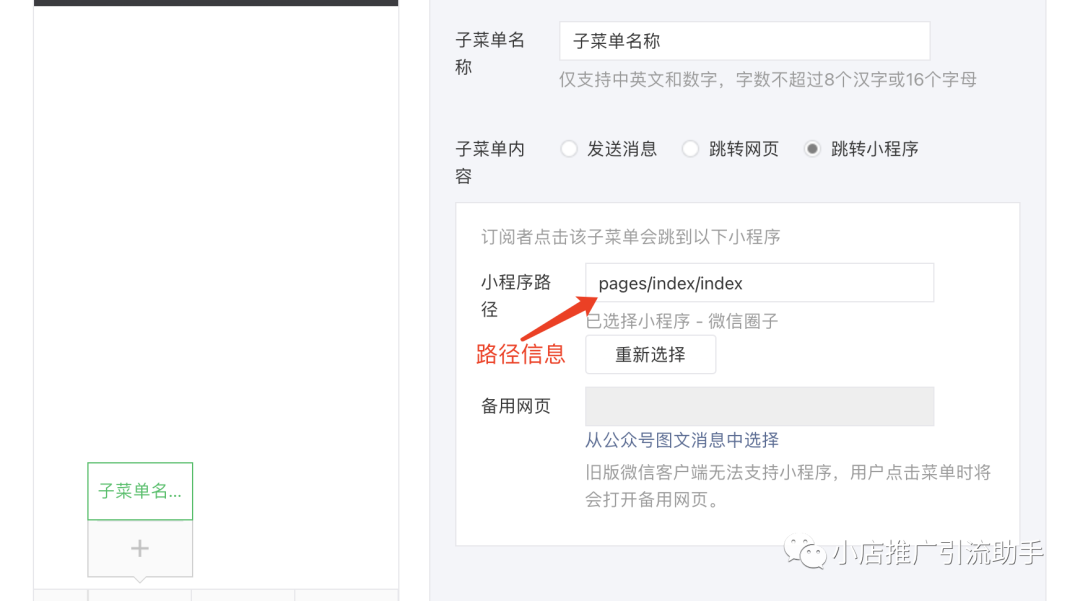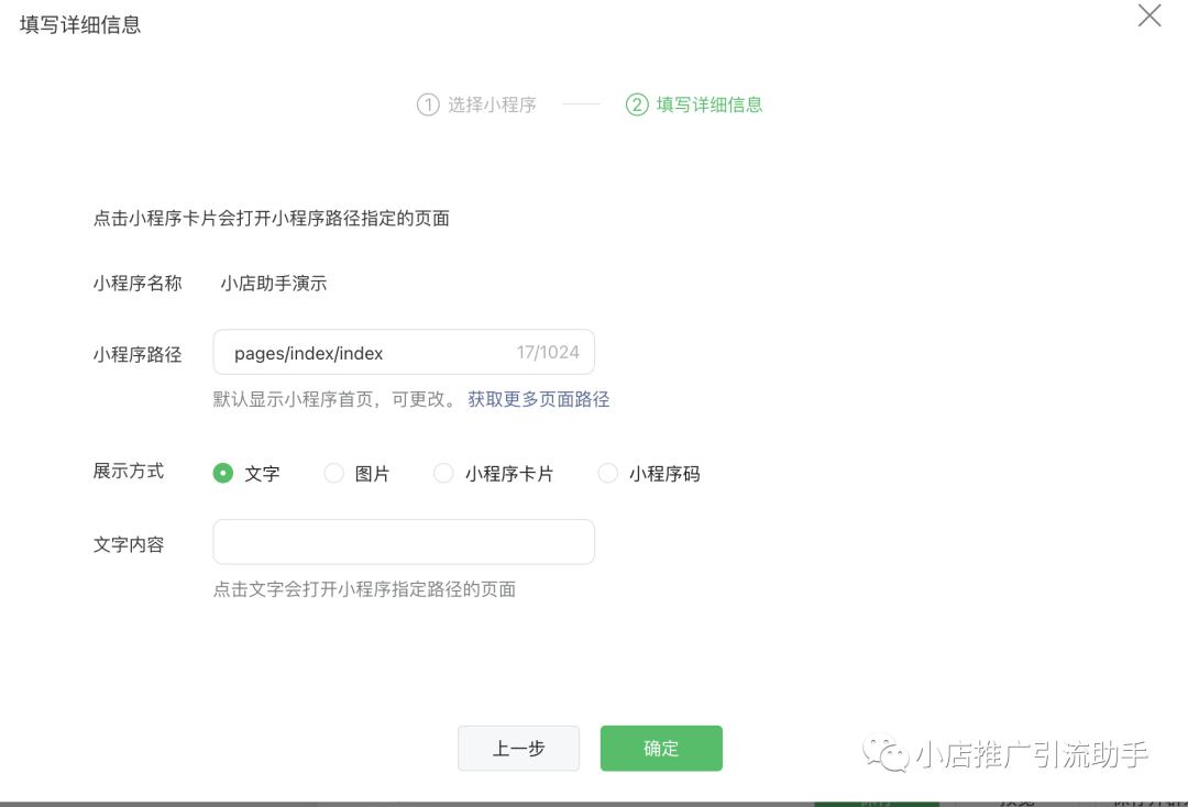 其中在第三步选择小程序以后如下,此处还需要输入路径信息,路径信息可以查看如何快速获取微信小商店页面路径信息。