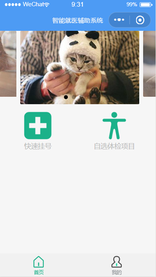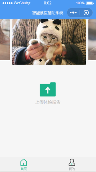 登录成功后,直接跳转到小程序主界面如图1.2.1,病人可以进行快速挂号、自选体检项目问诊、医生可以获取病人信息和预约信息、查看病人体检结果、检查人员可以获取病人信息和预约信息、上传体检者的体检结果等操作。