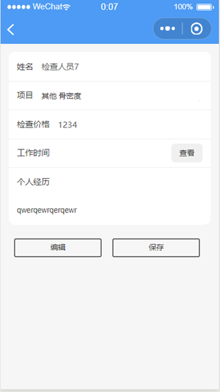 点击项目可以选择体检员自己的体检项目科室,点击工作时间可以查看自己的工作时间(周一至周日)点击编辑按钮可对自己的信息进行编辑。点击保存上传自己的信息至数据库。