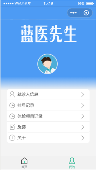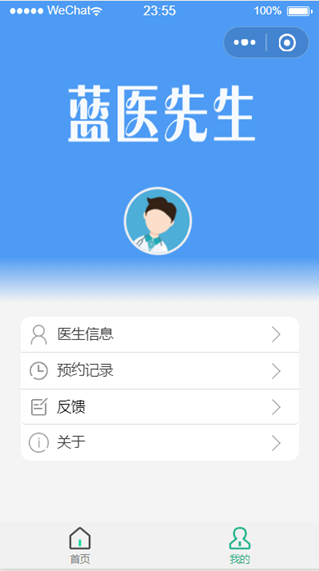 在医院医患人员众多人满为患时,人们往往想要提升诊断效率,简化就诊流程。此时就可以登录微信小程序蓝医先生。如果患者对自己目前病情症状不了解,需要医生给出检测建议,可以选择挂号功能,直接选择时间段进行预约挂号,并及时就诊。如果患者对自己的病情十分了解,只想对自己身体某项指标进行检测,就不用先去挂号再问医生再去体检,只需点击“自选体检项目”功能选择对应体检项目预约即可。医生用户可以看到哪个时间段有患者对自己诊室进行了预约。体检员用户可以看到哪个时间段有患者对自己的体检项目进行了预约。本系统采用线上挂号预约的方式,为医患就诊关系提供了很大程度上的便捷,有广泛的市场性和实用性,本项目的收益来源是和医院合作收取一定费用而得到收益。