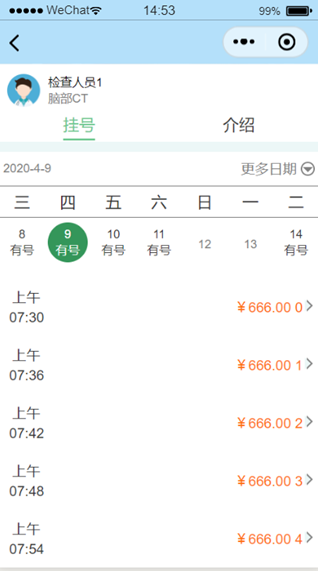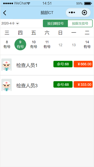 患者用户在选择检查部位后,如果部门有医生,则可以在日期不为灰色的选项中选择医生进行预约挂号如图1.4.2。