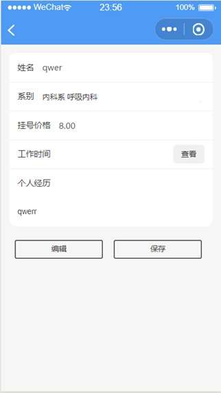 点击系别可以选择医生自己的系别科室,点击工作时间可以查看自己的工作时间(周一至周日)点击编辑按钮可对自己的信息进行编辑。点击保存上传自己的信息至数据库。