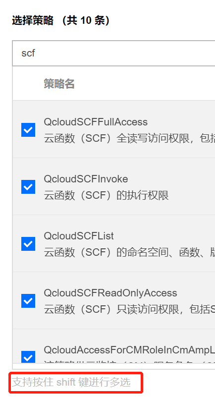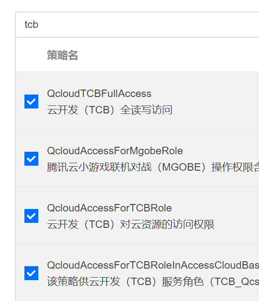 在搜索框里搜scf,tcb后,有什么策略就勾选什么策略